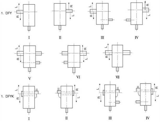按輸出軸分,DFY可分為I、II、III、Ⅳ、V、Ⅵ、Ⅶ七種裝配型式,DFYK可分為I、II、III、Ⅳ四種裝配型式。如需配逆止器時(shí)請(qǐng)注明(一般為自配)。