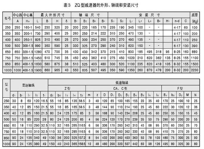 zq型減速器的外形、軸伸和安裝尺寸見圖2和表3。
